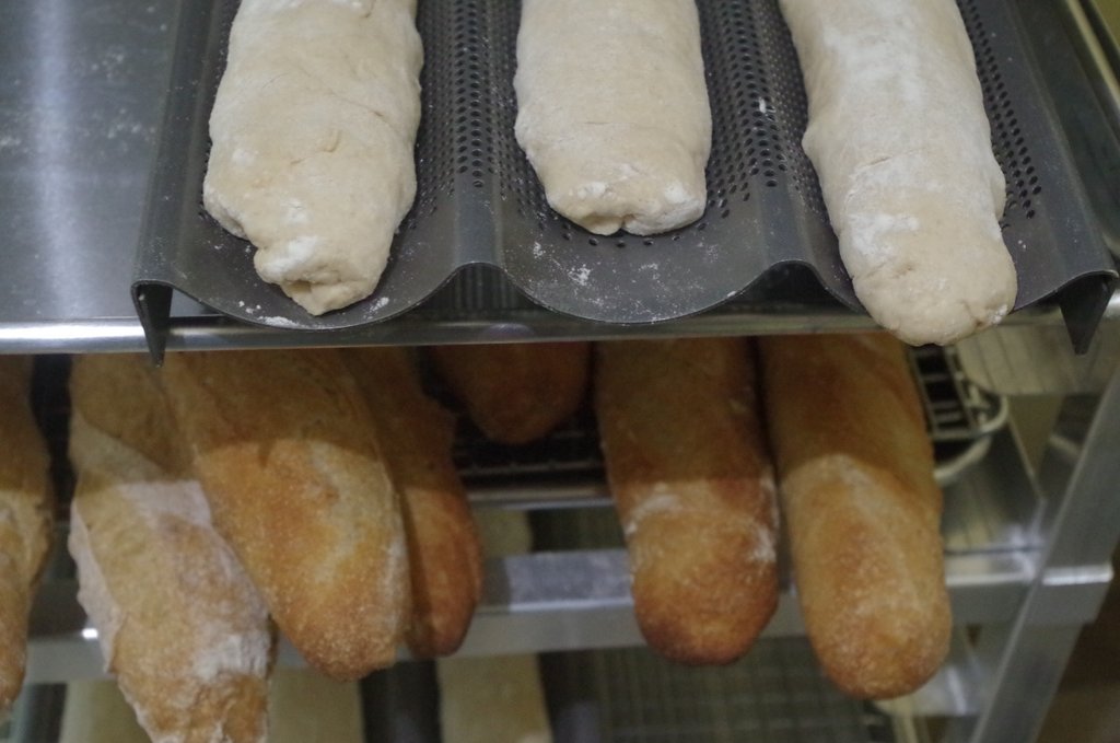 The Market isn’t until Saturday, but the bread making begins on Thursday. To get the light, fluffy texture in the baguettes and the best flavor, the dough spends a lot of time developing. Bill makes a small amount of dough on Thursday, which is called the “preferment.” On Friday morning, more flour is added, then I do lots of stretching and folding throughout the day to help chewy gluten develop. In the evening, Bill has a complicated choreography of shaping, resting, and reshaping before the bread is cooked. The dance continues during cooking with precise timing and the addition of steam, to help create the perfect crust.